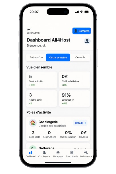 Pilotez votre conciergerie en un coup d’œil : CA, satisfaction, interventions.